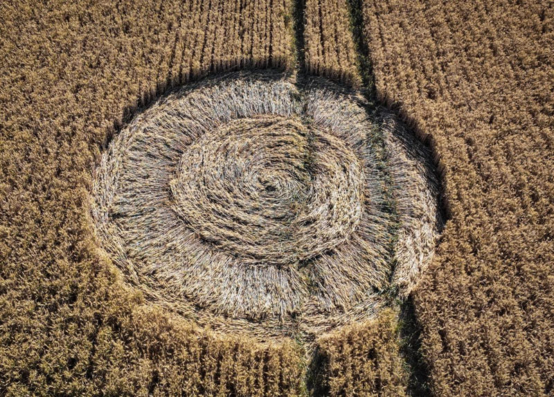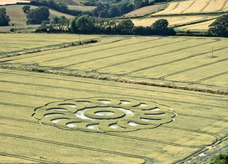 Ware Farm Manor, near Lyme Regis, Devon. 28th June. 170 feet (51.8 m) diameter. Wheat. This crop circle features central rings, surrounded by twelve overlapping crescent shapes arranged in a precise circular pattern, resembling interlocking petals or gears – Copyright © Nick Bull 2025 Stonehenge Dronescapes Photography