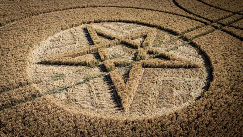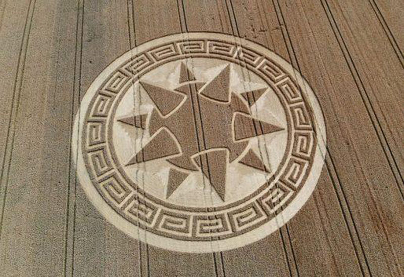 Frieding, near Andechs, Bavaria, Germany. A central circular motif resembling the head of a mace, bordered by a Greek ‘key’ design. Wheat. c.250 feet (76 m) 20th July 2025 – Copyright © Toni Bartl